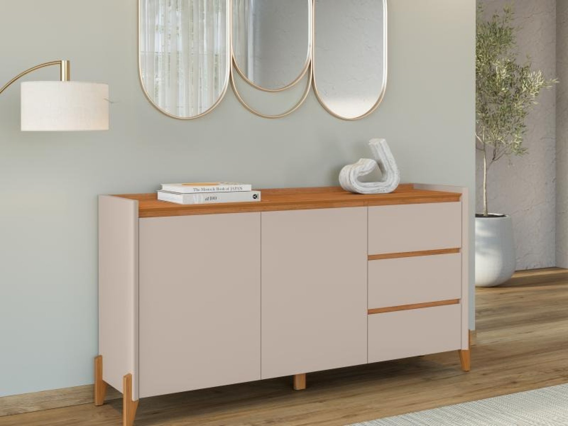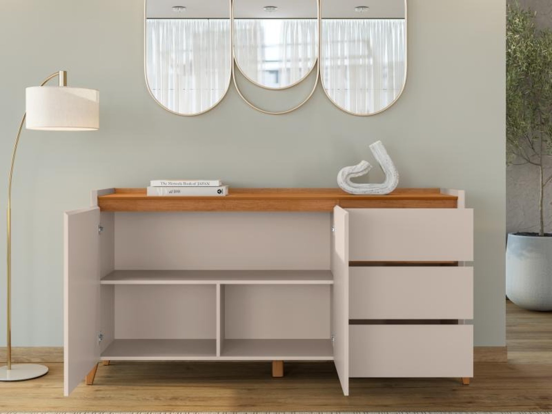 O Buffet Rennes combina design moderno e funcionalidade, ideal para organizar utensílios de cozinha, pratos, copos e objetos decorativos. Com acabamento em pintura UV, possui 3 gavetas com corrediças telescópicas, 2 portas com dobradiças soft-close, 1 prateleira interna e pés em madeira maciça, garantindo resistência e sofisticação ao ambiente.