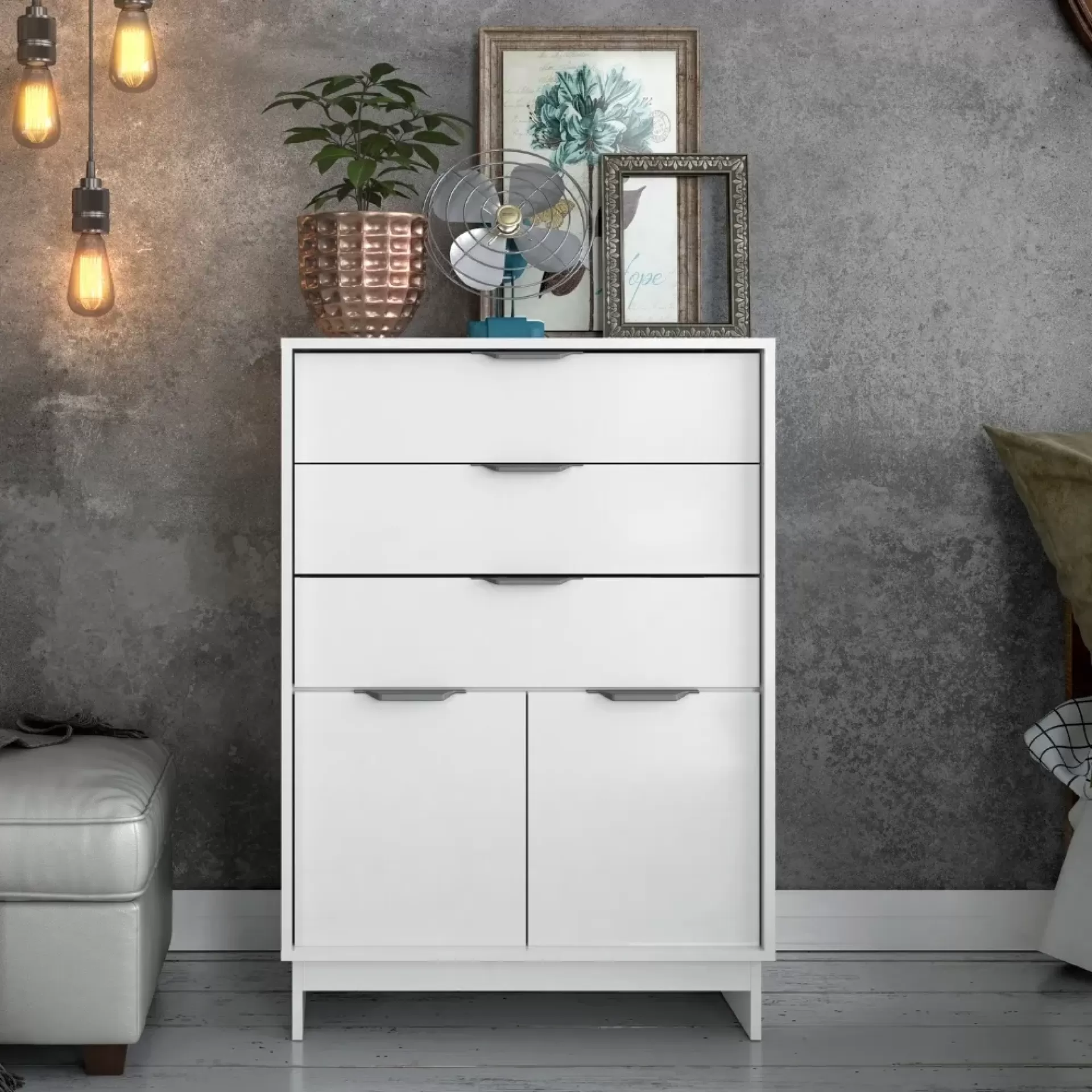 A Cômoda Carraro é a escolha ideal para quem busca organização e estilo. Com três gavetas espaçosas e duas portas de giro, oferece praticidade no armazenamento de roupas e objetos. Os puxadores na cor Champagne trazem elegância ao design clean. Conta ainda com corrediças metálicas para abertura suave das gavetas e pés estruturais que facilitam a limpeza do ambiente.