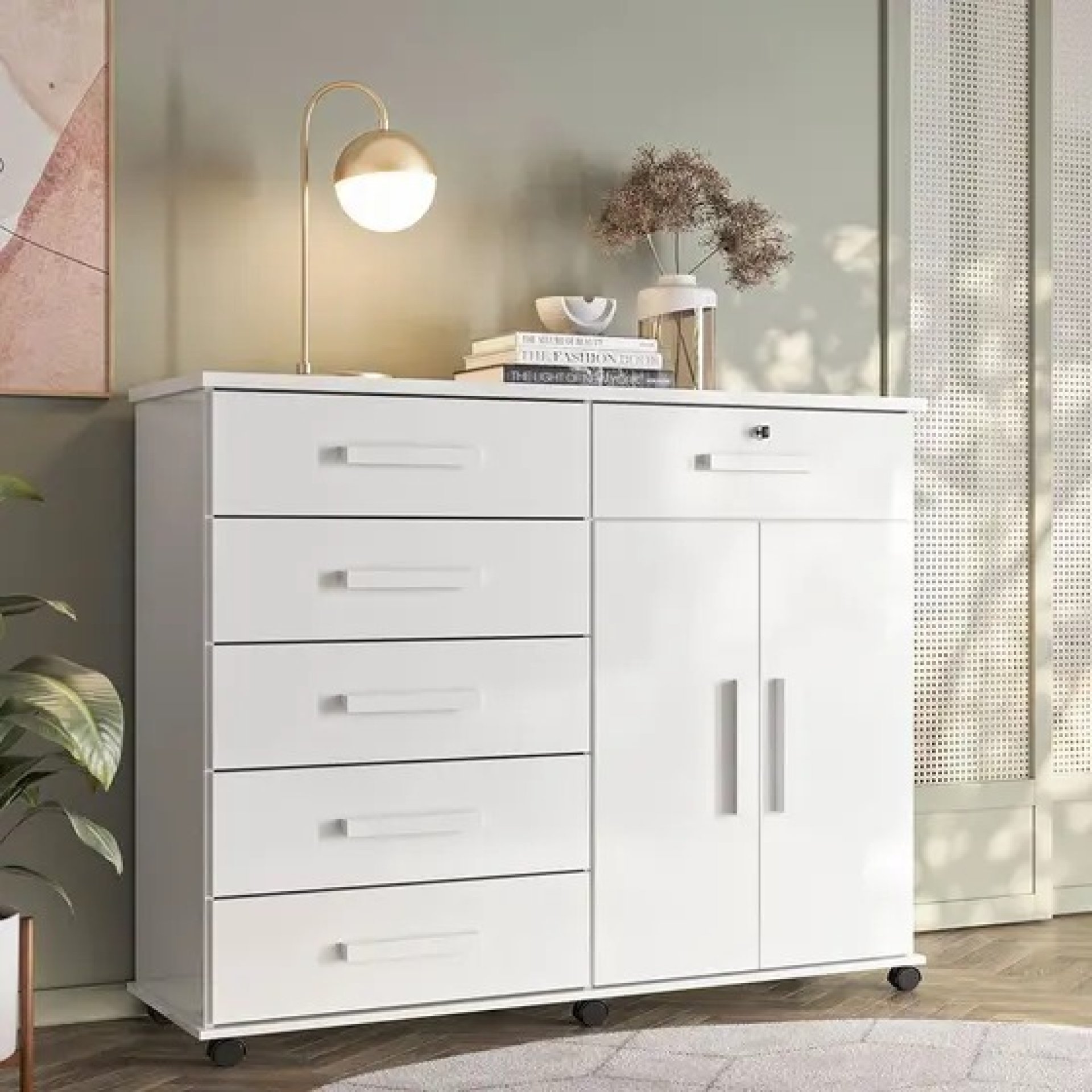 6 gavetas com corrediças telescópicas e travas, sendo 1 com chave.