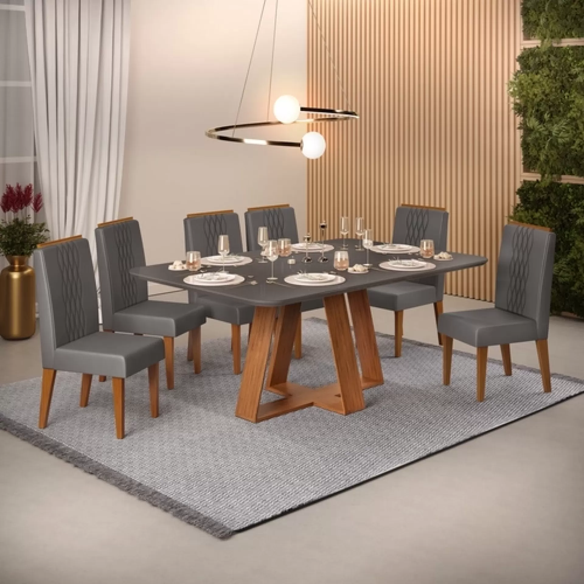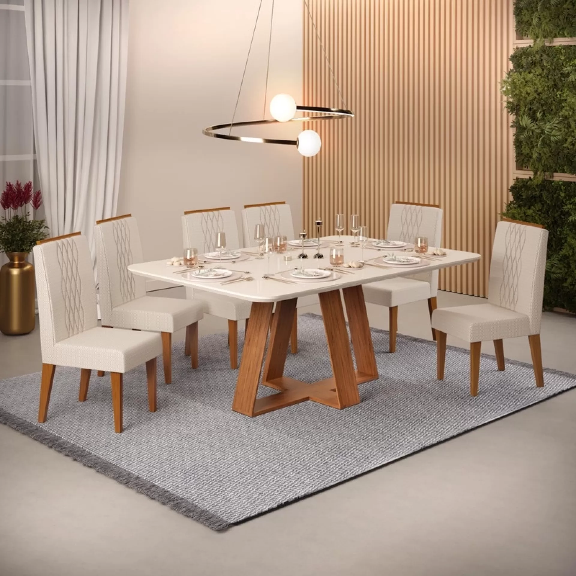 ✔ Medidas: Largura 1,60 m | Altura 80 cm | Profundidade 90 cm ✔ Capacidade: Acomoda até 6 lugares ✔ Design moderno: Base em formato trapézio inclinado com detalhes geométricos ✔ Tampo: MDF chanfrado com vidro aplicado para mais durabilidade e fácil limpeza ✔ Cantos arredondados: Mais segurança para o ambiente ✔ Otimização de espaço: Cadeiras podem ser guardadas sob a mesa ✔ Proteção extra: Sapatas deslizadoras para evitar contato direto com o chão
