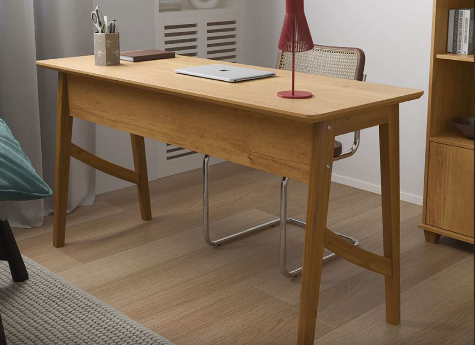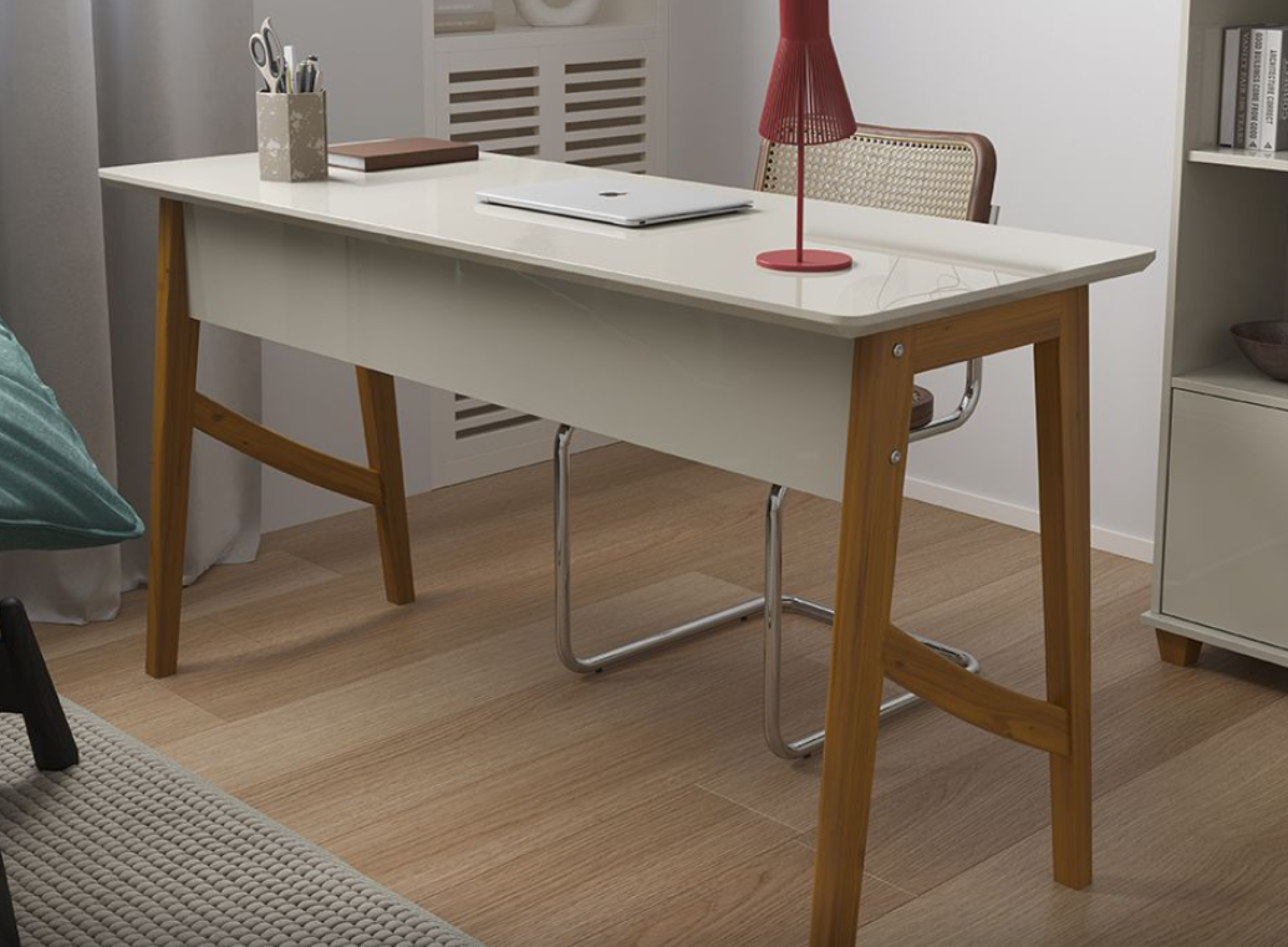 Com um design excepcional, possui tampo em MDF de 25 mm chanfrado e pés em madeira maciça com sapatas protetoras para não riscar o piso. Sinta a sofisticação do puxador clean e a praticidade da gaveta com corrediças telescópicas, que oferece abertura total e deslizamento suave. Garanta a sua agora!