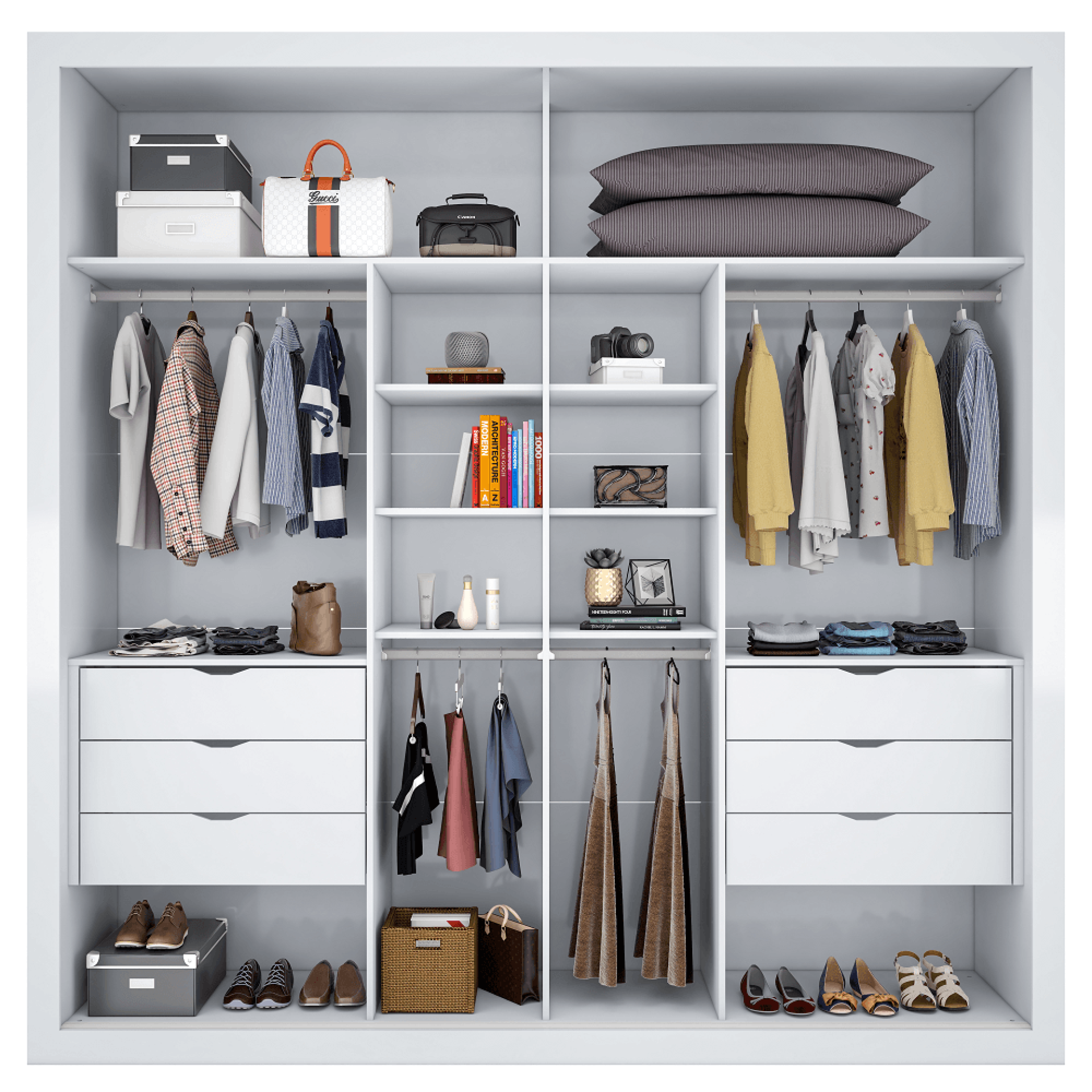 O Guarda-Roupa Funcional e Sofisticado combina design moderno e organização prática, oferecendo 6 gavetas internas, sendo 2 com divisórias, e corrediças telescópicas para abertura suave. O acabamento interno uniforme confere elegância, enquanto cabideiros e suportes metálicos garantem resistência e durabilidade. Um móvel ideal para trazer praticidade e estilo ao seu ambiente.