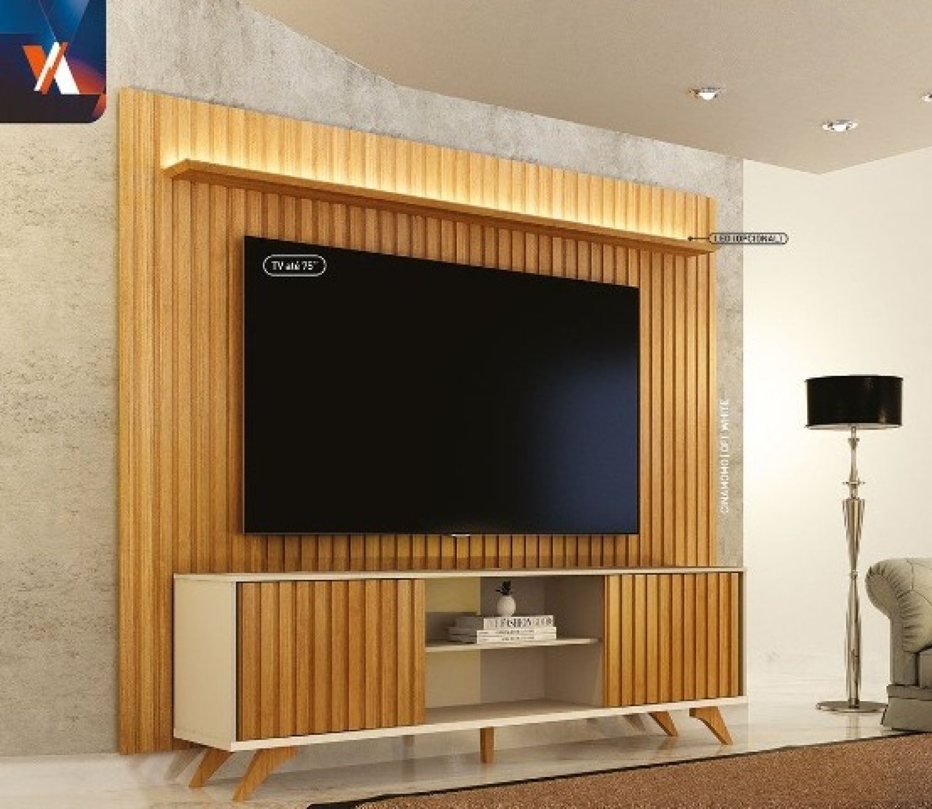 O Painel Vitória possui prateleira de 25 mm para decoração e organização, além de estrutura imponente que comporta TVs de até 80”.