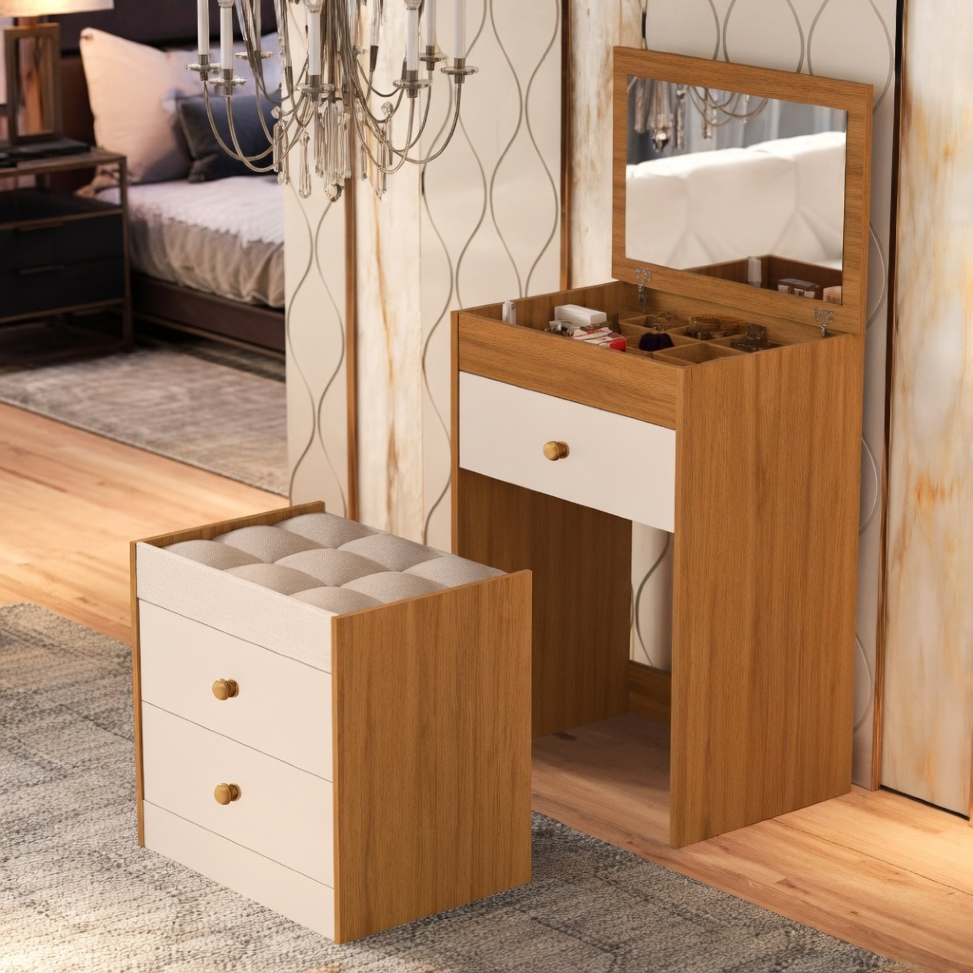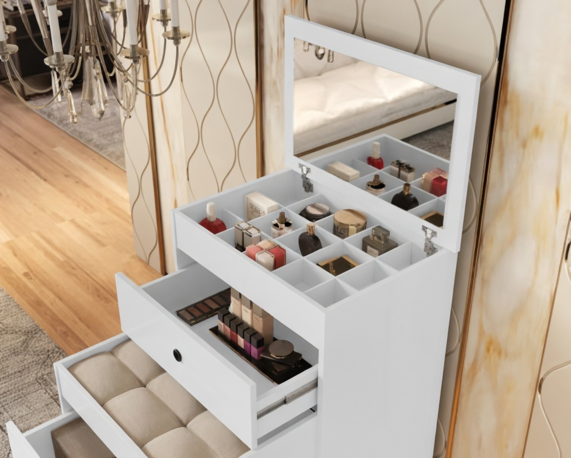 Configuração: 3 Gavetas funcionais para cosméticos e joias.