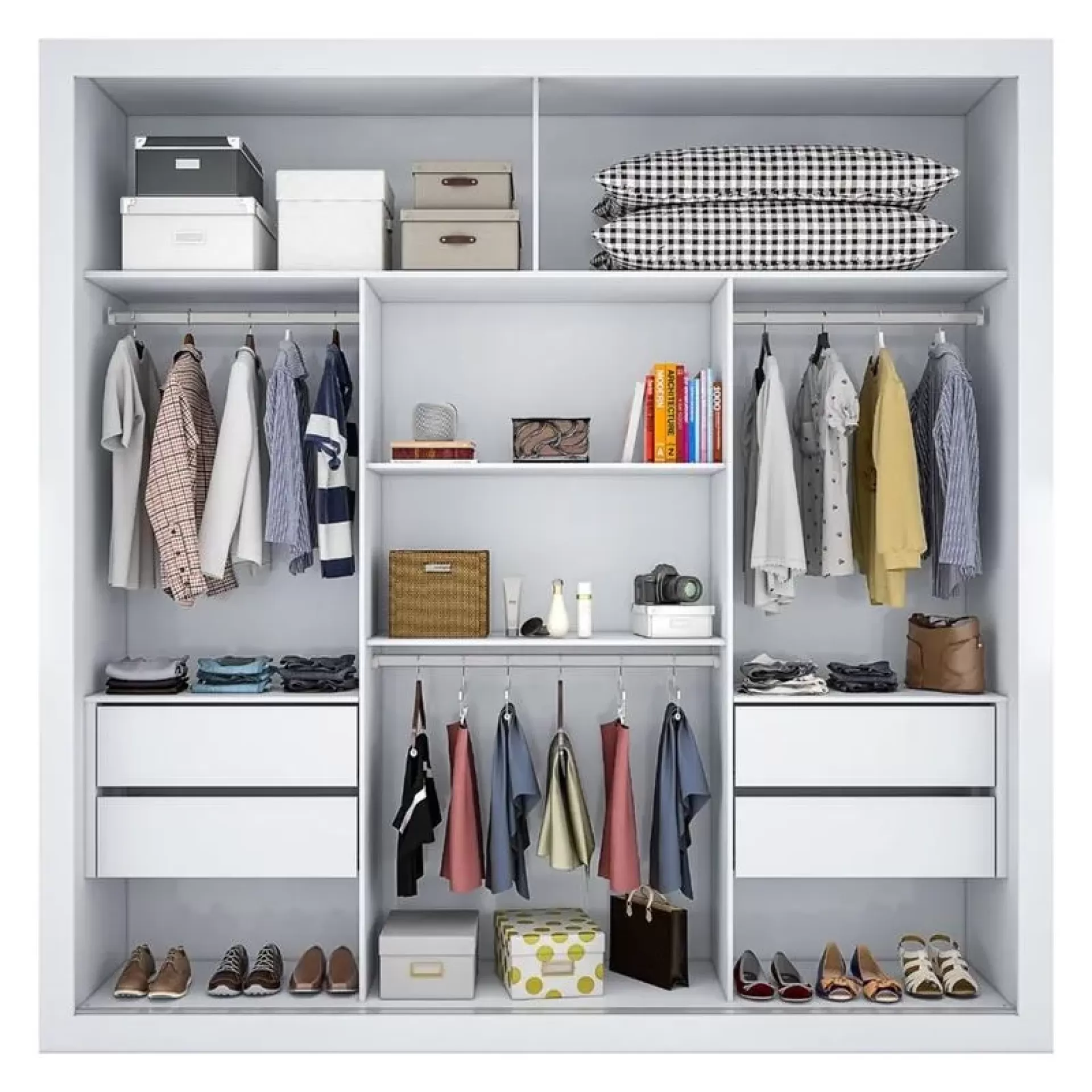 Suas quatro gavetas internas são equipadas com corrediças telescópicas, garantindo uma abertura suave e completa. Além disso, o modelo conta com calceiro e cabideiros metálicos, proporcionando resistência e durabilidade.